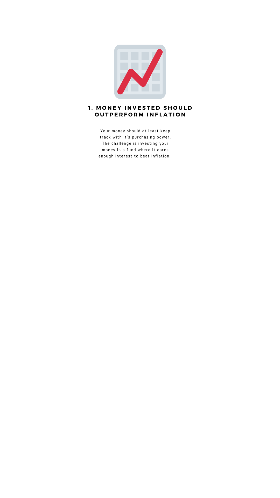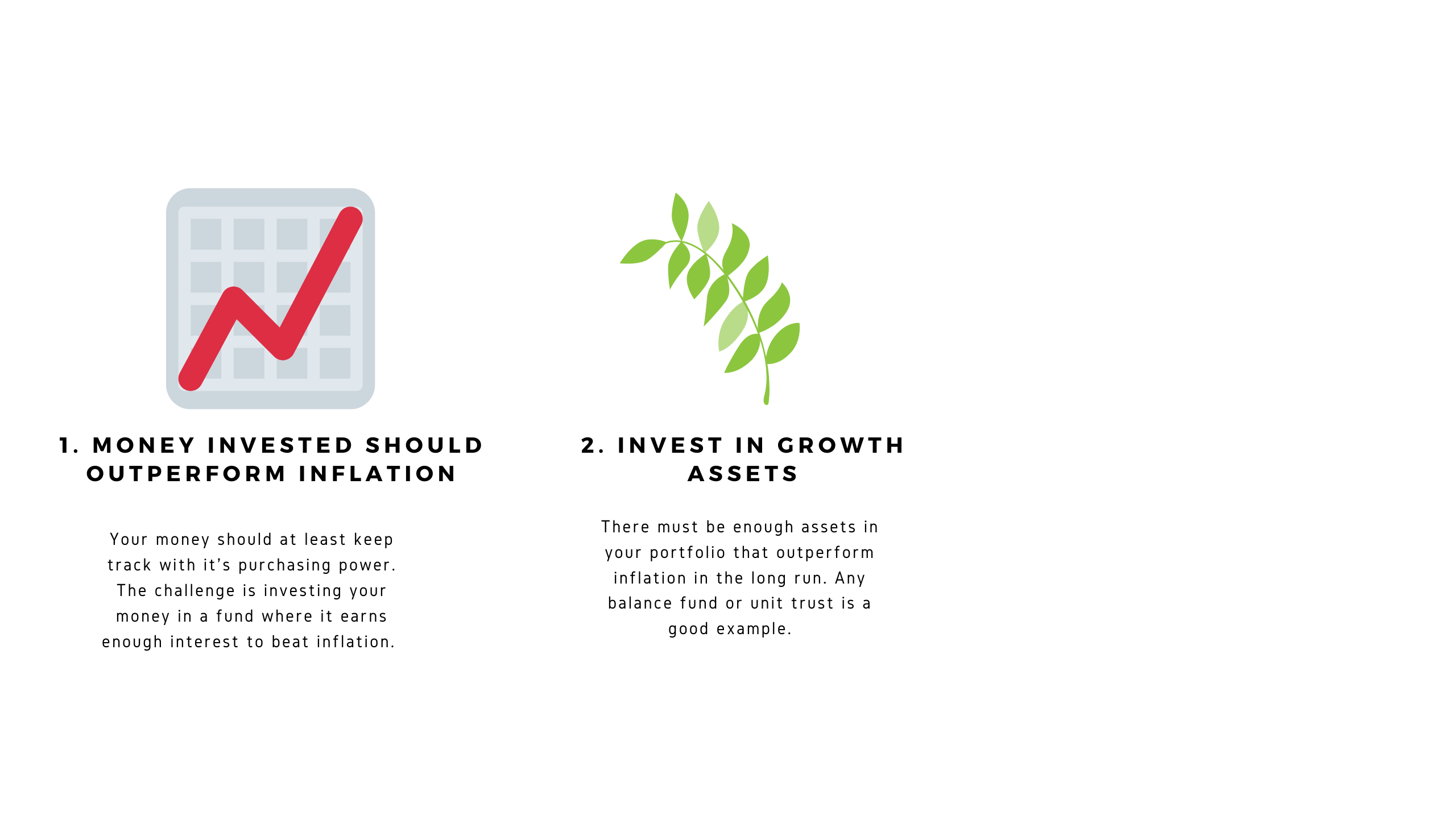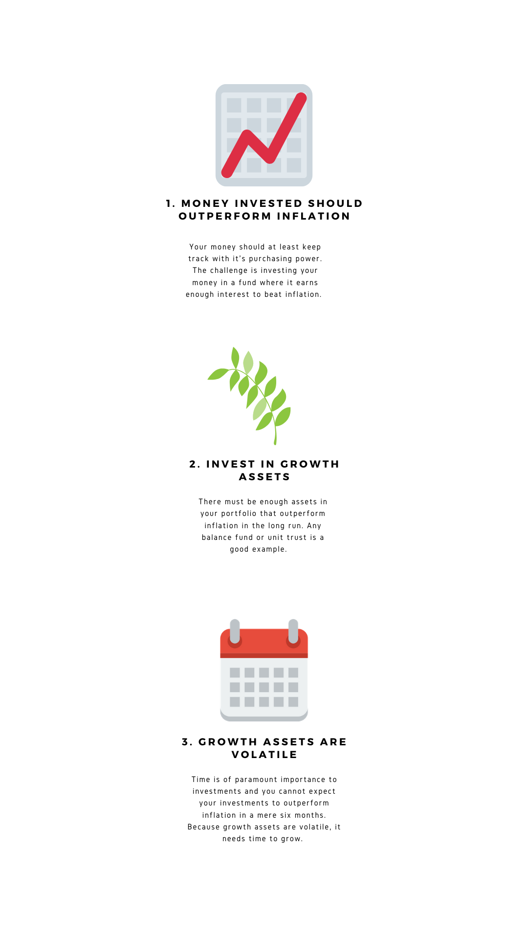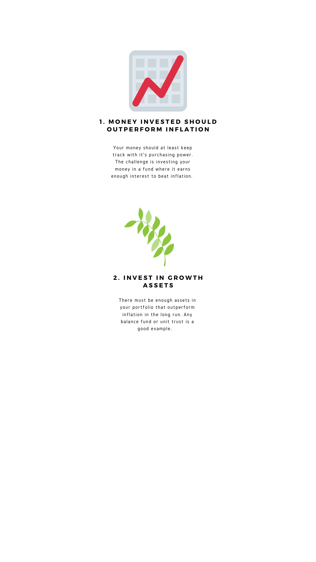 In the long run, inflation is your investments' biggest enemy because it erodes the buying power of your money. "At Momentum, for example, our flagship funds all have a goal to beat inflation by a certain number," Jeanette says.