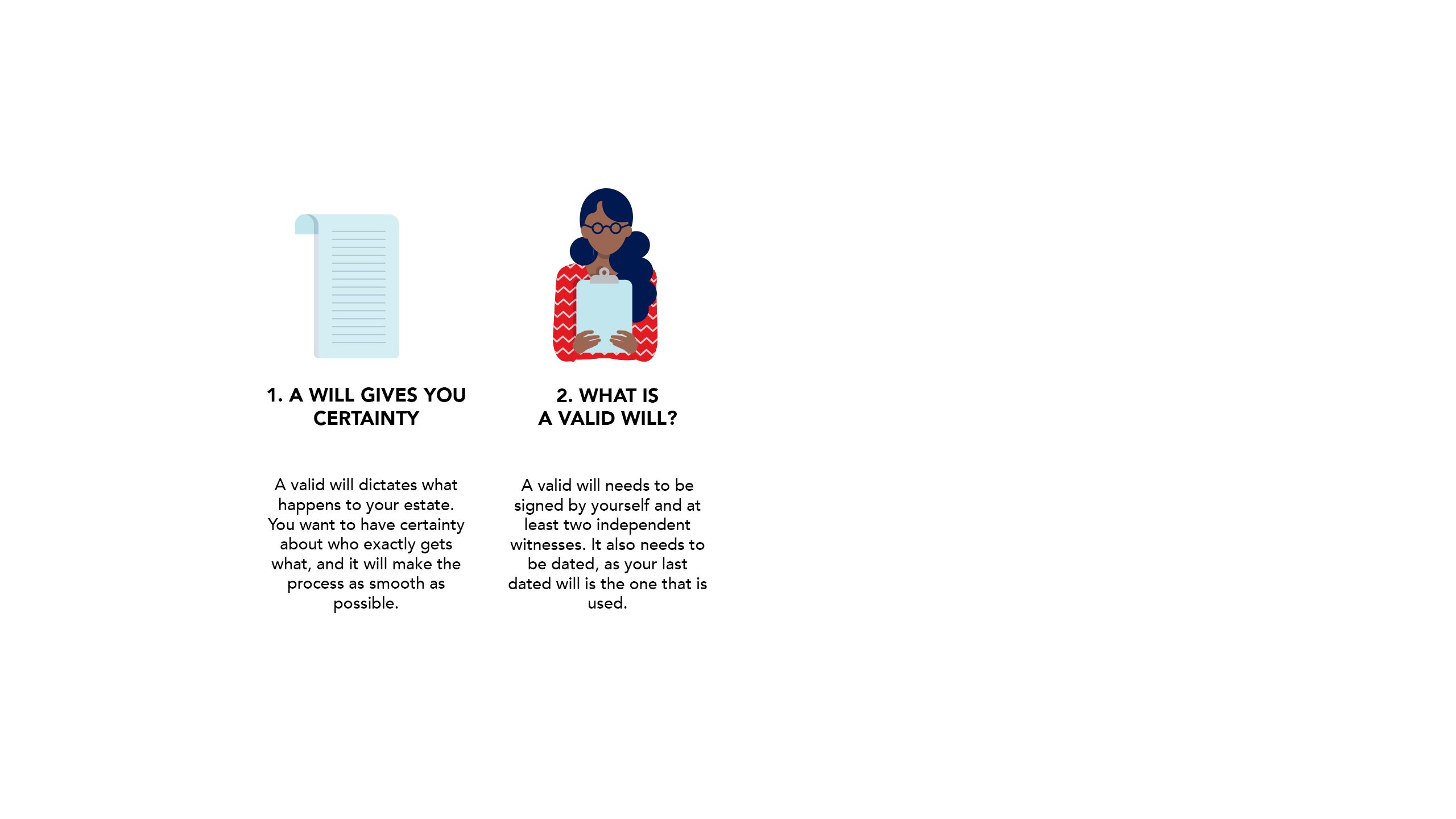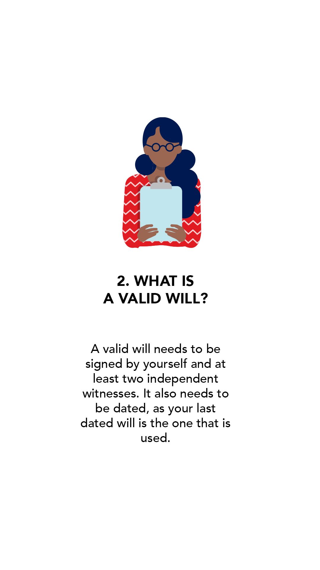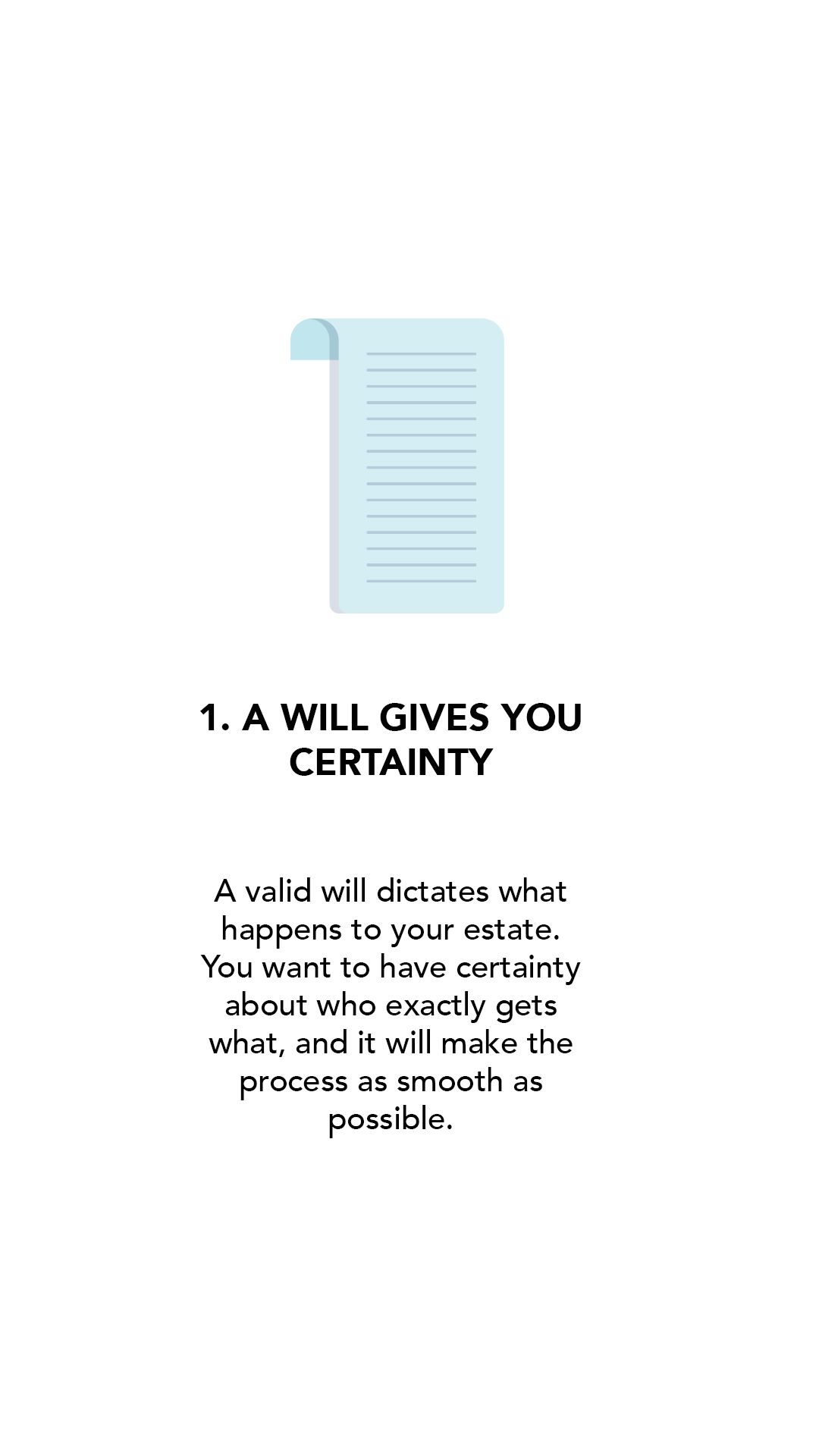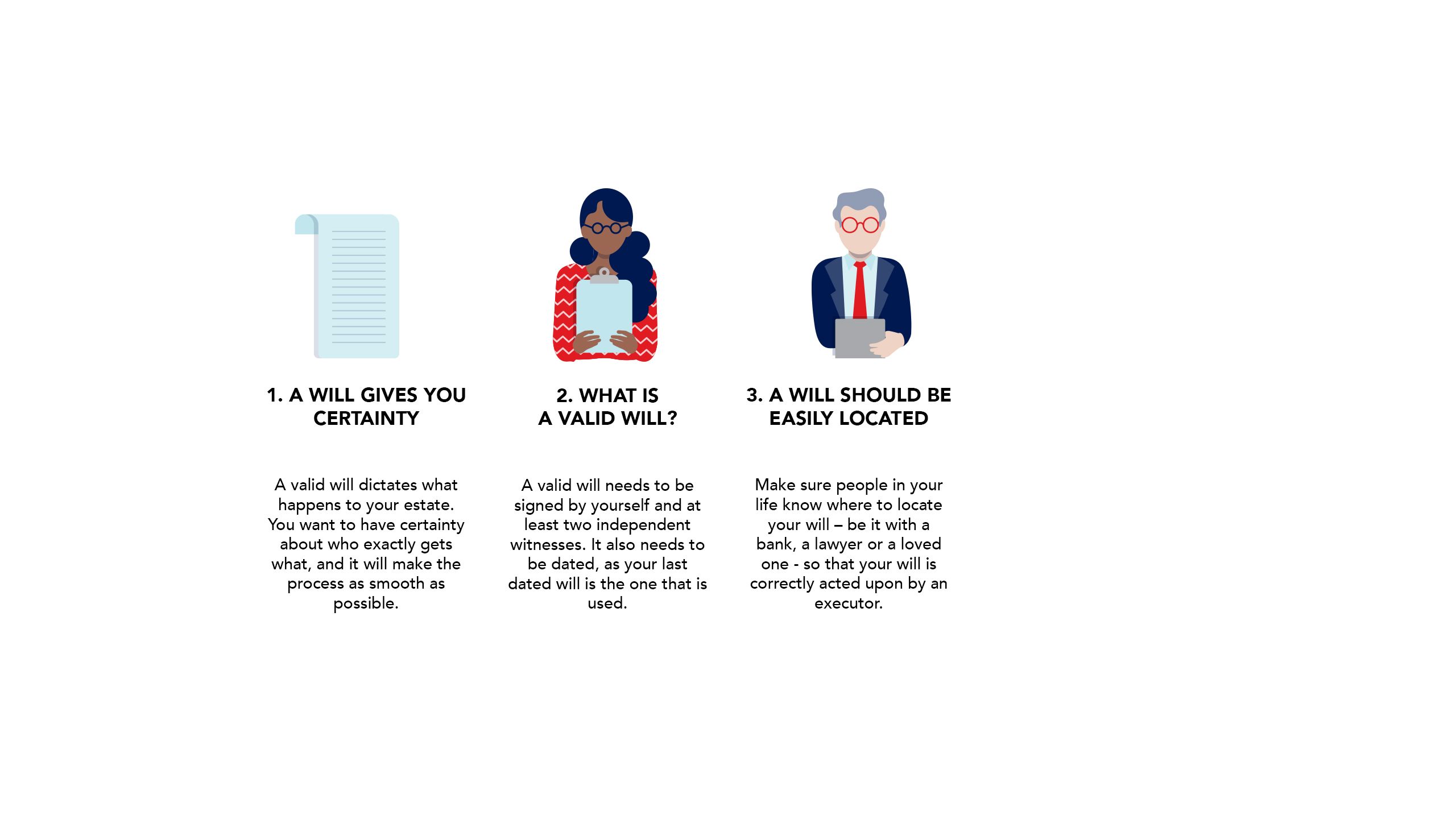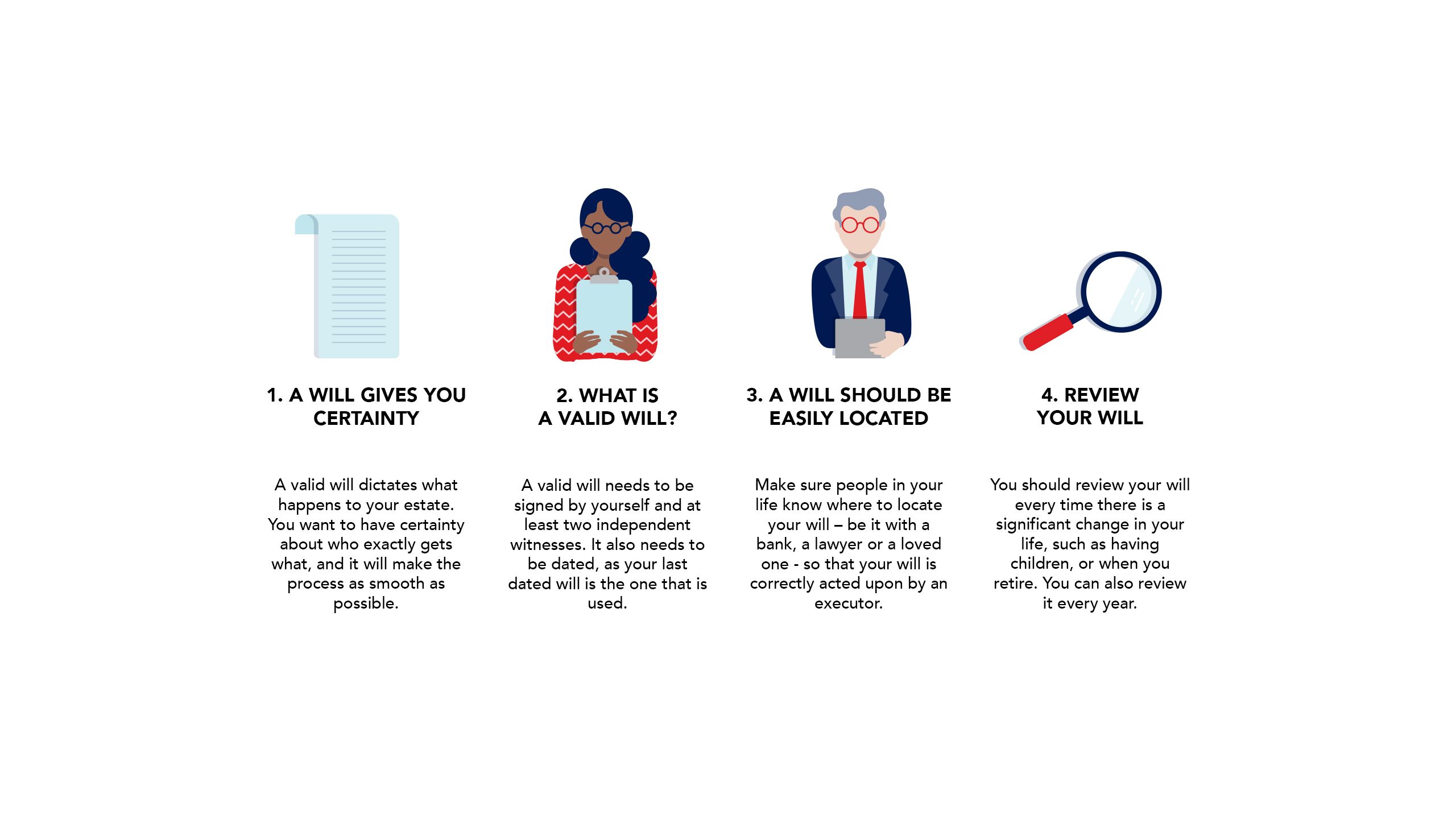 1. A Will is a legal document – there are many requirements required to have a valid Will, such as which witnesses signing for it, the dates, and how frequently it is updated. Understand the rules.