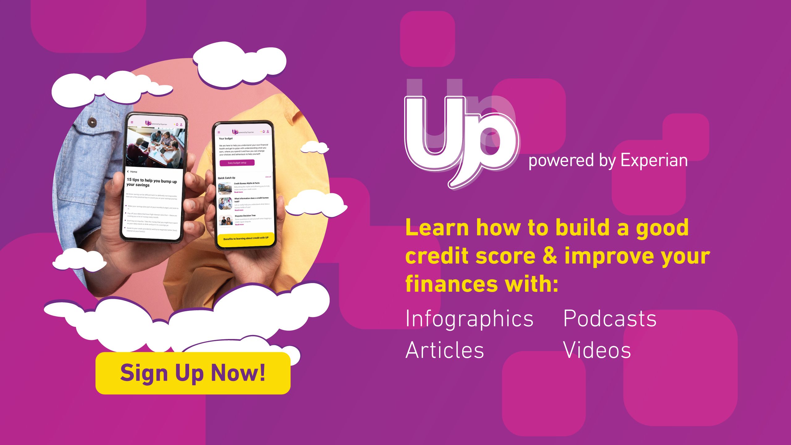 Wise Up with Experian’s free credit information and education web-based app, Up. A credit, budgeting and learning experience to help you take control of your financial health.